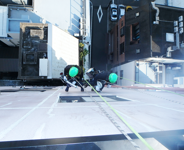 練馬区でリフォームを承っております当社のロープを使った施工は屋根にアンカーさえ打ち込むことができれば施工可能でございます。
