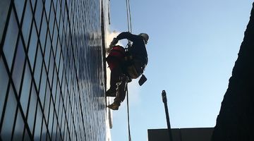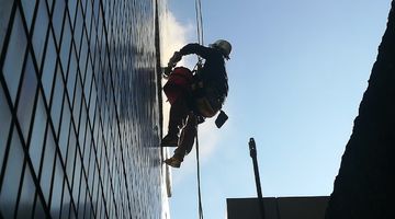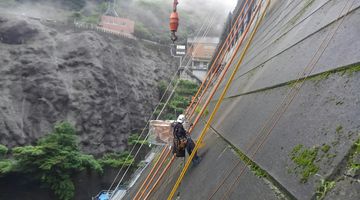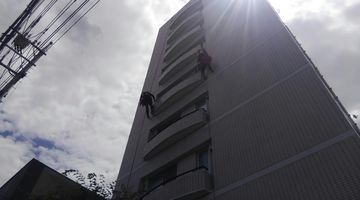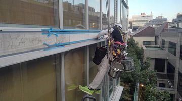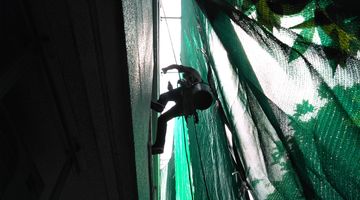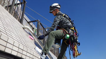 当社はロープを使用した施工を行い、従来の足場を使った方法では施工することが出来なかった場所も施工可能でございます。